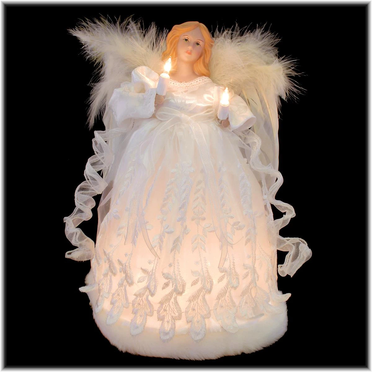 Add a heavenly glow to your Christmas dΓ©cor with this beautiful angel tree topper! Featuring an exquisite hand-painted face and soft feathered wings, this gorgeous angelic figure is robed in a shimmering satin dress with a richly embroidered overlay trimmed with faux fur. Illuminated with 10 clear mini lights, our lovely 12″ ivory angel tree top is sure to illuminate your holidays for many years to come. Features include: