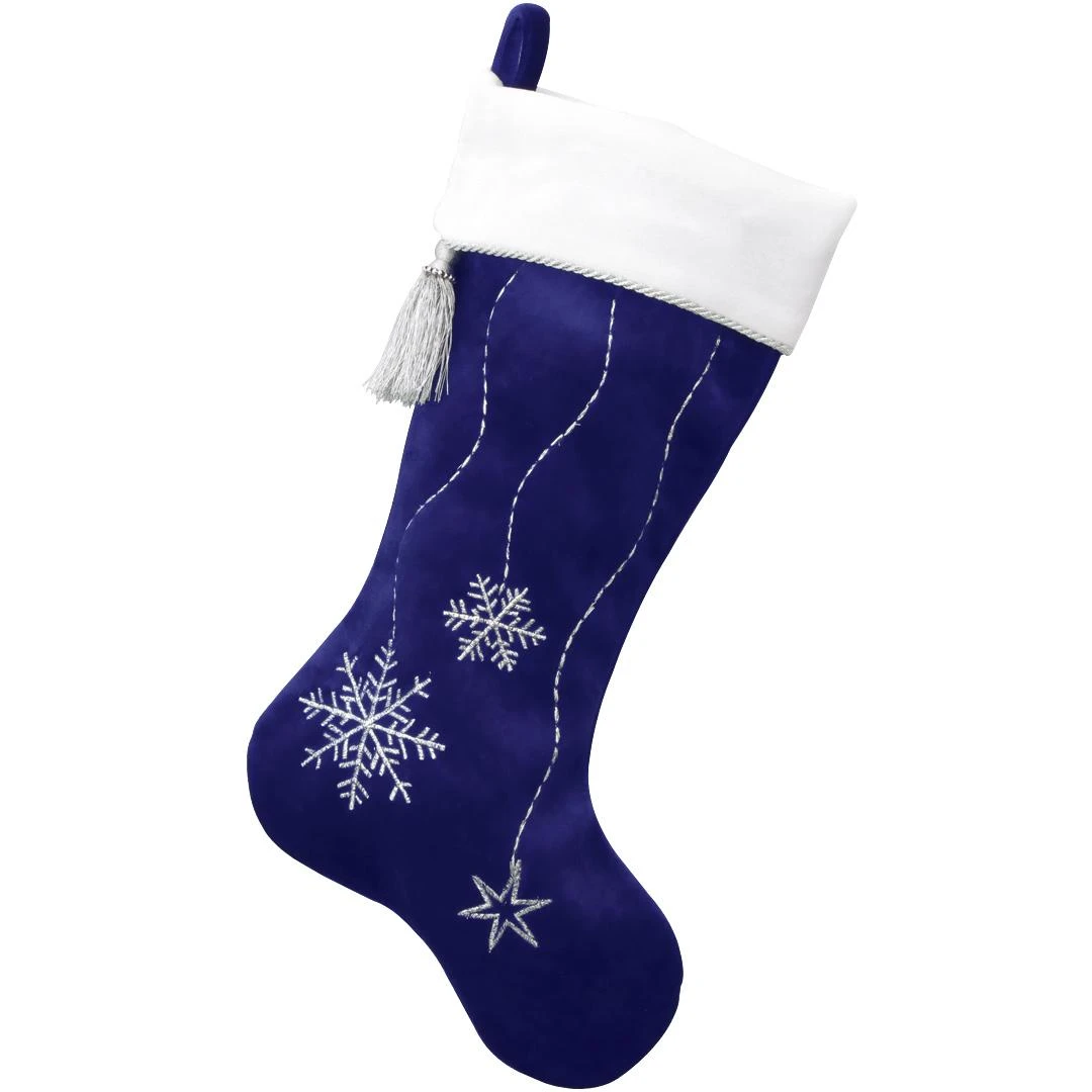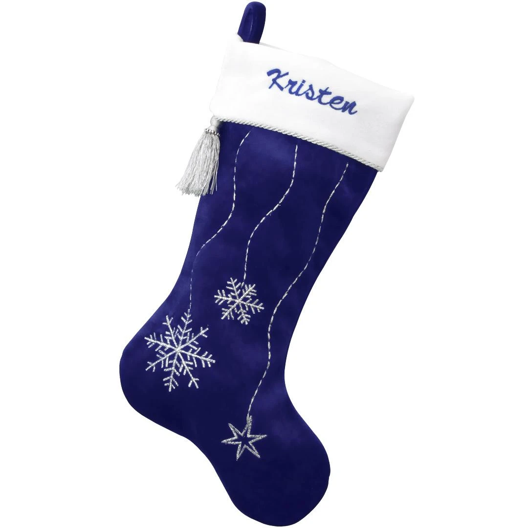 Santa could fill anyoneโs imagination with this royal blue velvet stocking. This 18ยฝ” stocking is ready to delight the recipient with its silver snowflake and star design. The silver tassel dangling from its white folded cuff beckons your family to sneak a peek inside for a delightful surprise. Allow Bronner’s to artfully embroider your choice of name in brilliant blue along the vivid white cuff of this blue snowflake stocking at no additional charge!