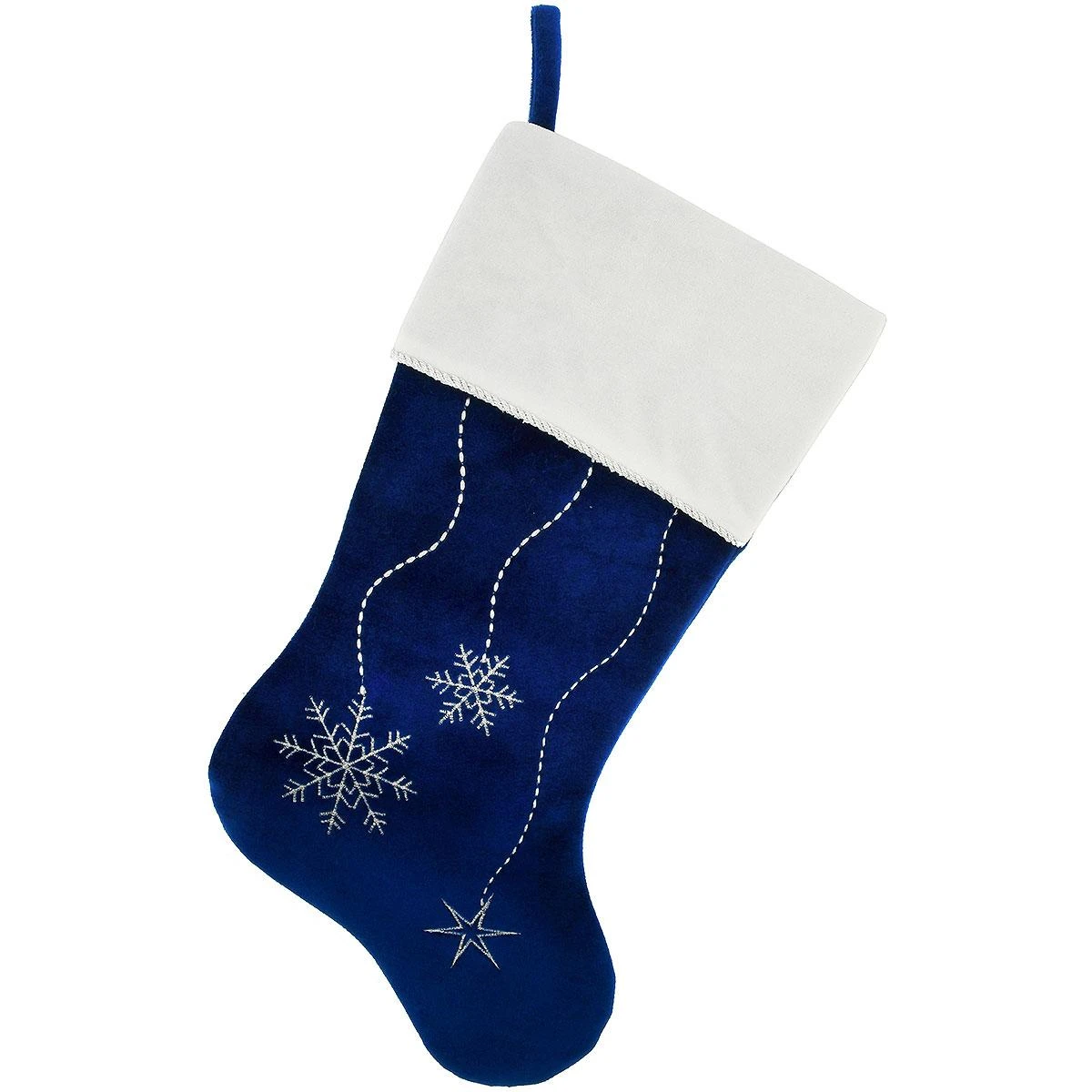 Glittering snowflakes–in a cascade of silver stitching–tumble gracefully down this gorgeous 20.5″ blue velvet stocking. Sure to be a holiday favorite, sock is topped with a white velvet cuff trimmed with silver braiding and is completely lined with polyester.