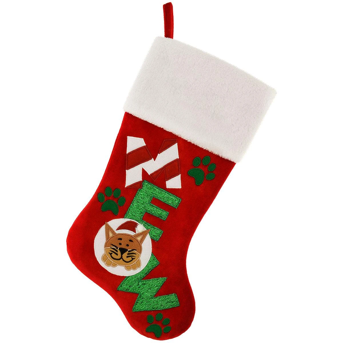 Looking for the purrrr-fect stocking for your four legged friend? This cute stocking features an adorable cat in a Santa hat along with paw prints and “MEOW”. This 20.5″ stocking for pet cat is crafted of rich red velvet with fleece and sparkling lamé appliques and is completely lined with polyester.