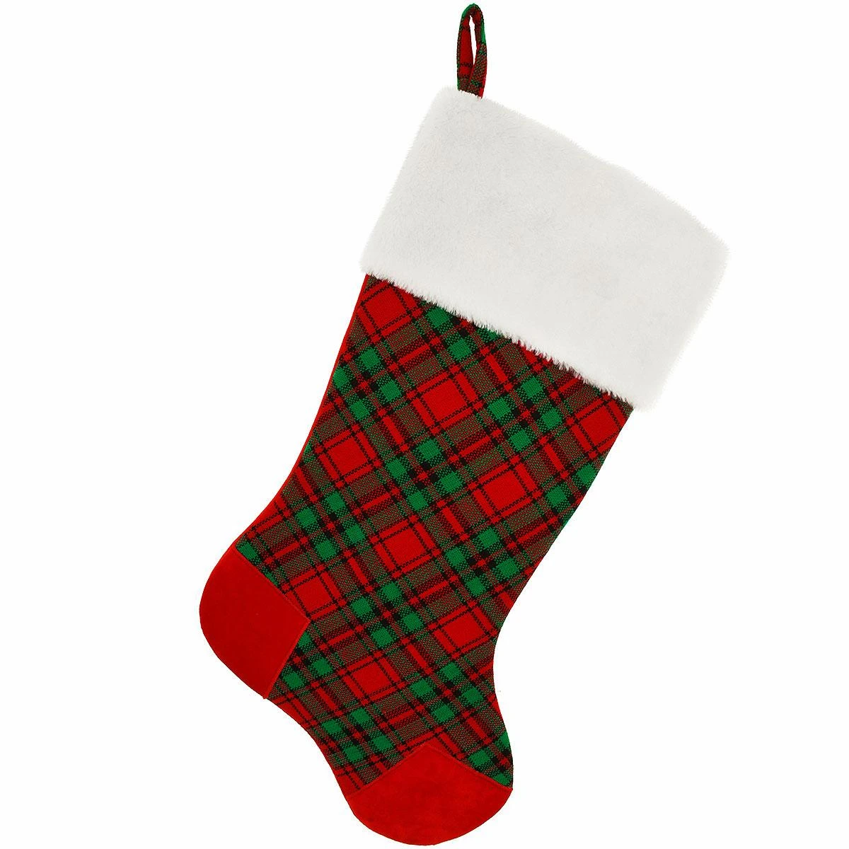 A special someone will be tickled red and green to receive this festive 20½” plaid stocking as a gift! Stocking features cheery red patches on heel and toe and sock is completely lined in red sateen with a white faux fur cuff.
