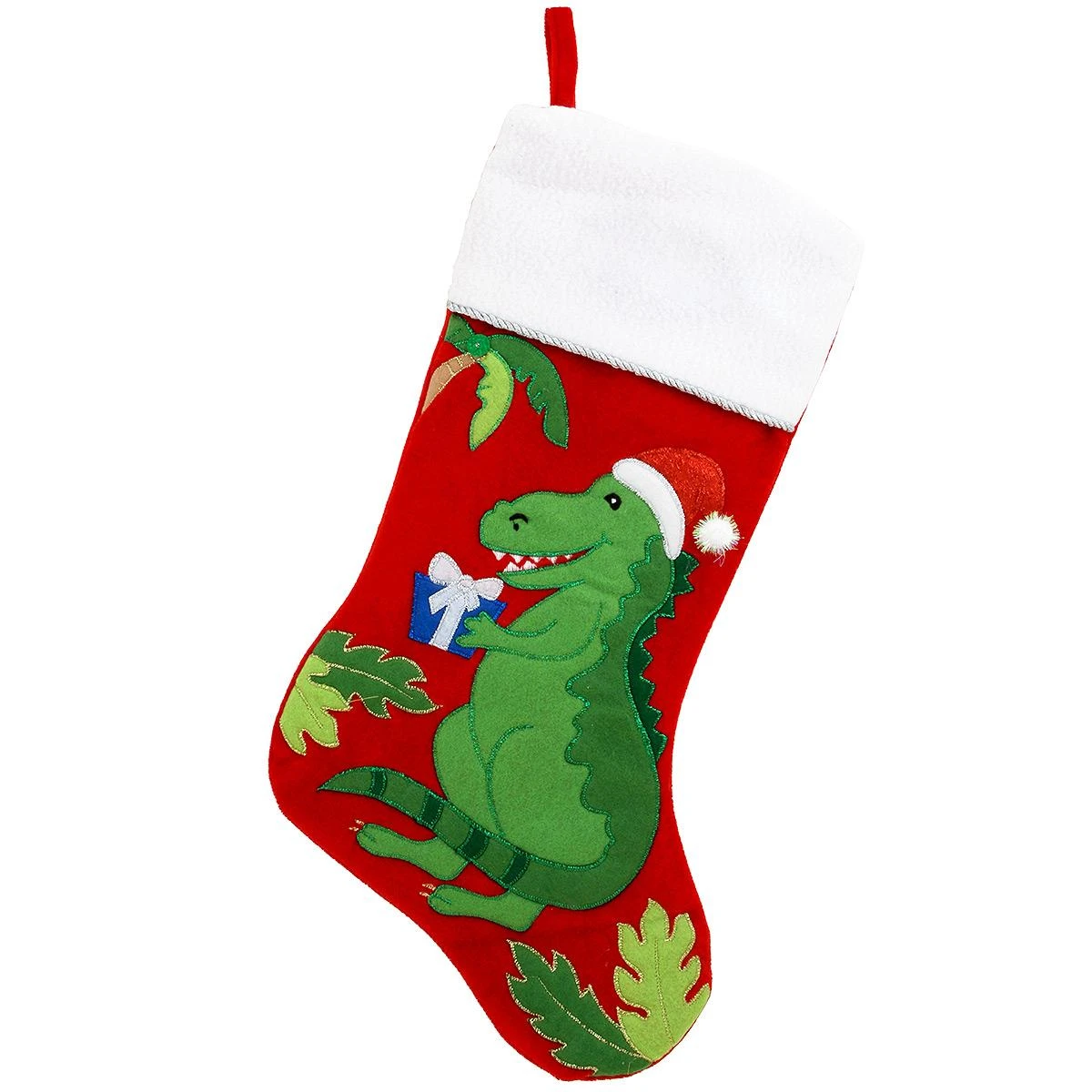 Why not personalize this dino-mite stocking with the name of your dinosaur lover? Featuring a green T-Rex dressed in a Santa hat, our 20½” red velvet stocking is adorned with colorful felt appliques accented with sparkling thread. Allow Bronner’s to artfully embroider your choice of name in green along the cuff of this Christmas keepsake at no additional charge!