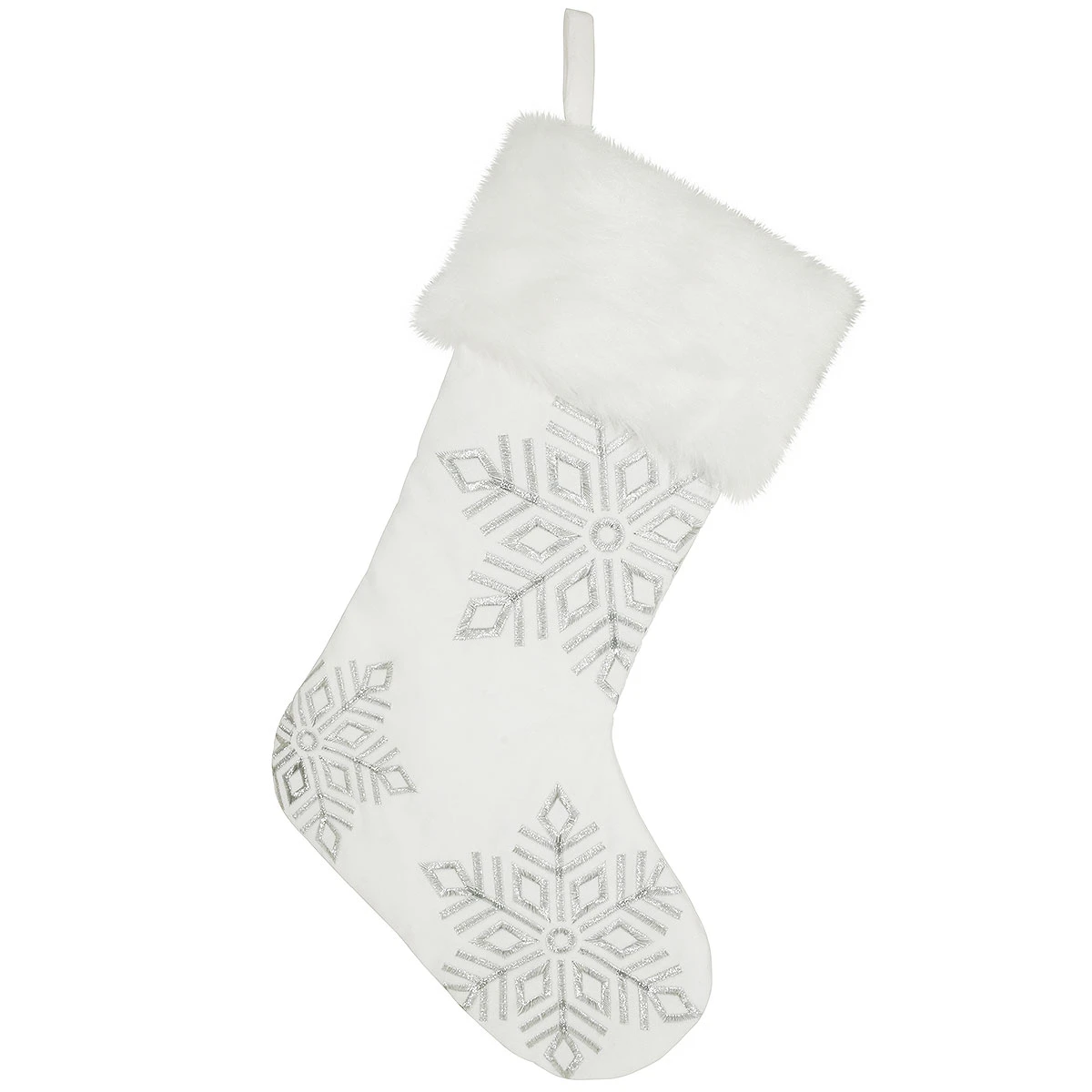 21 Inch White Velveteen Stocking With Silver Snowflakes