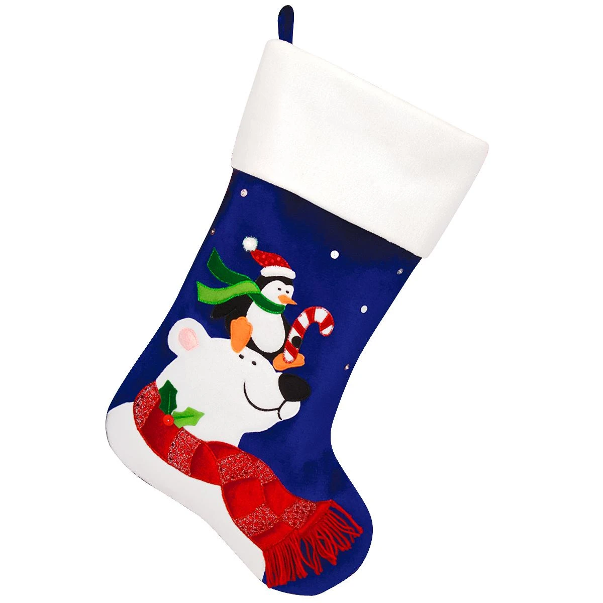 24 Inch Personalized Blue And White Velvet Stocking With Polar Bear And Penguin