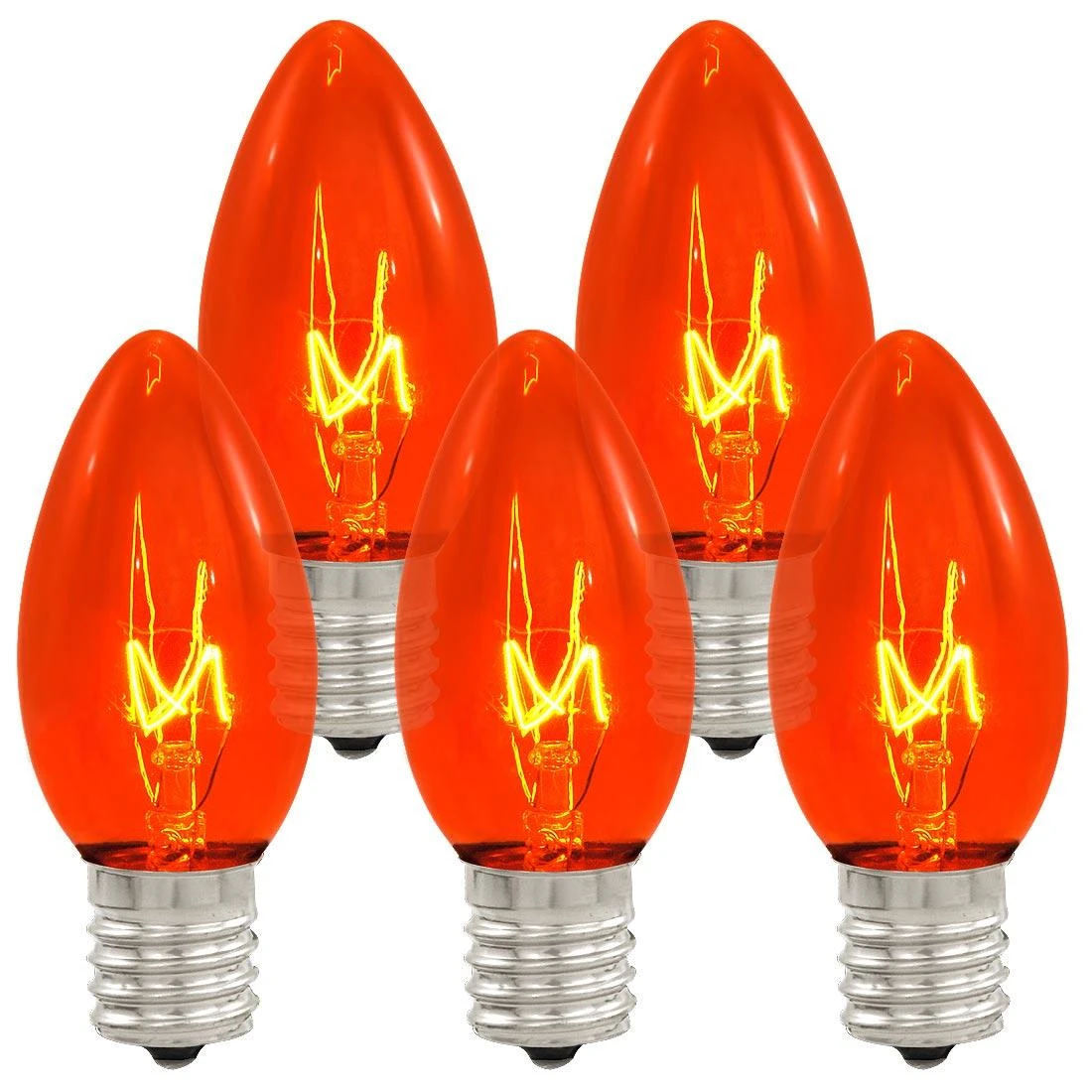 Restore an opulent flair to that old light strand with this deLIGHTful pack of transparent C9 replacement lamps! 25 amber-colored C9 replacement lamps are double-coated with pigment to shine brightly with rich color. Commercial grade, these replacement bulbs feature weatherproof bases and fade-and peel-resistant coatings to withstand winter weather and corrosive ocean air.