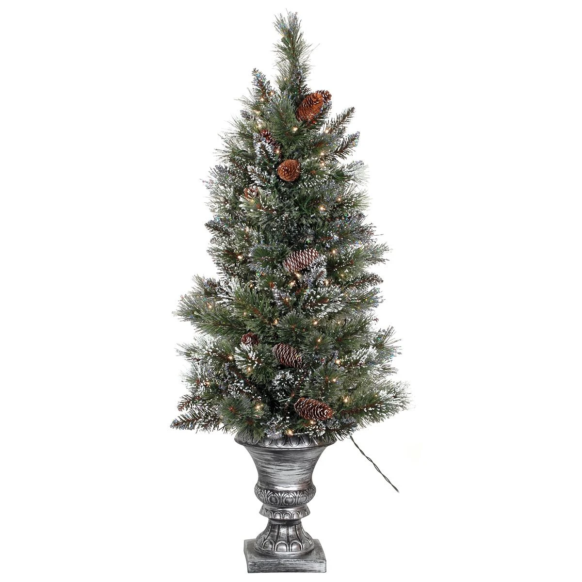 This pre-lit 4′ Glitter cashmere artificial tree has all the beauty of a real tree, but without the work of putting on the Christmas lights! Features folding branches (150 tips) with 100 clear lights to brighten your holidays. Includes a 5 year warranty for the tree and 2 year warranty for the lights. 20″ diameter base and weighs 15 pounds.