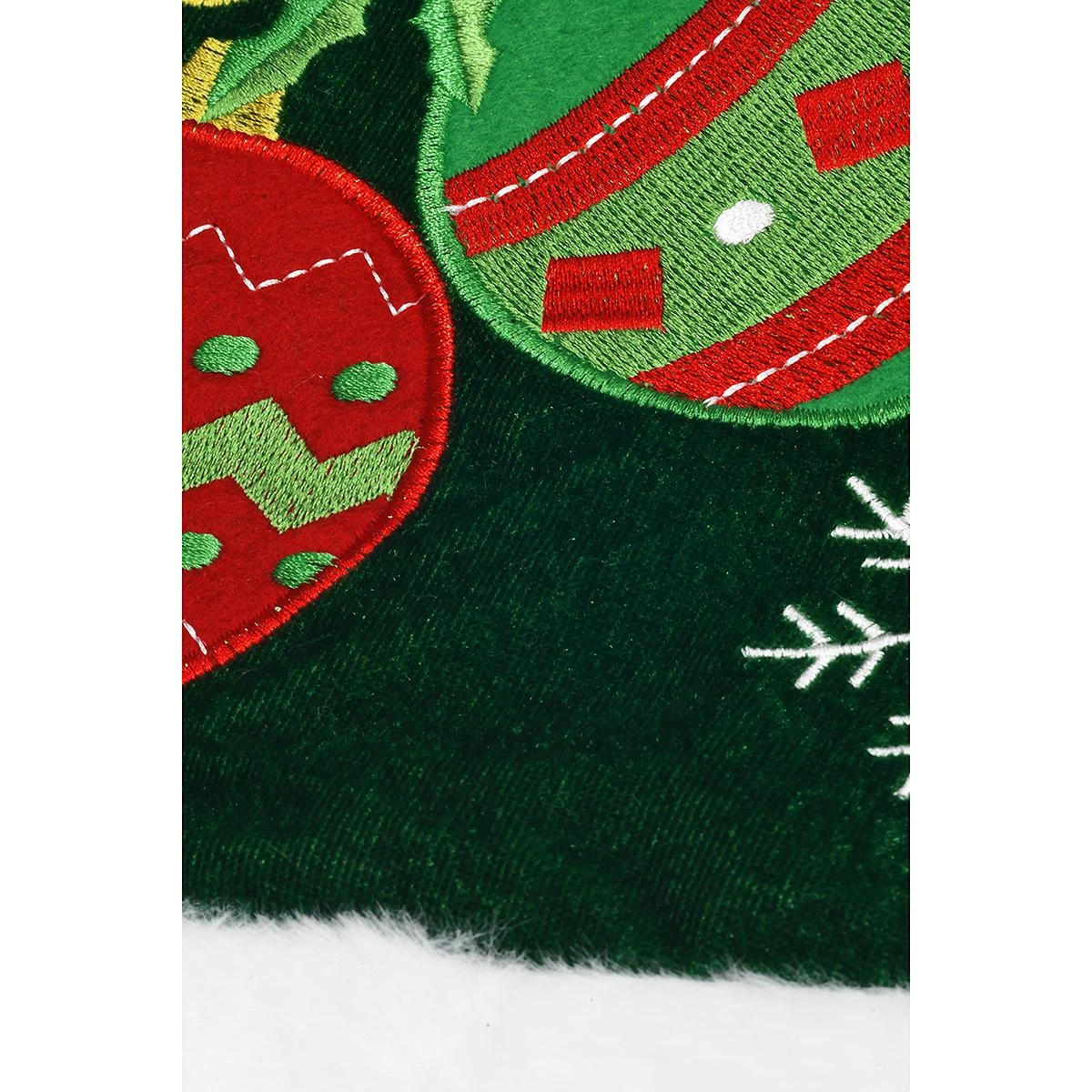 There are beautiful ornaments hanging ON your tree, so why not add some BELOW the tree as well? Crafted of micro velvet in vibrant emerald green, our 48″ tree skirt features colorful ornament appliques and a flurry of white stitched snowflakes. Edged with white fur, skirt is fully lined in white felt and features hidden Velcro strips to hold it securely in place.
