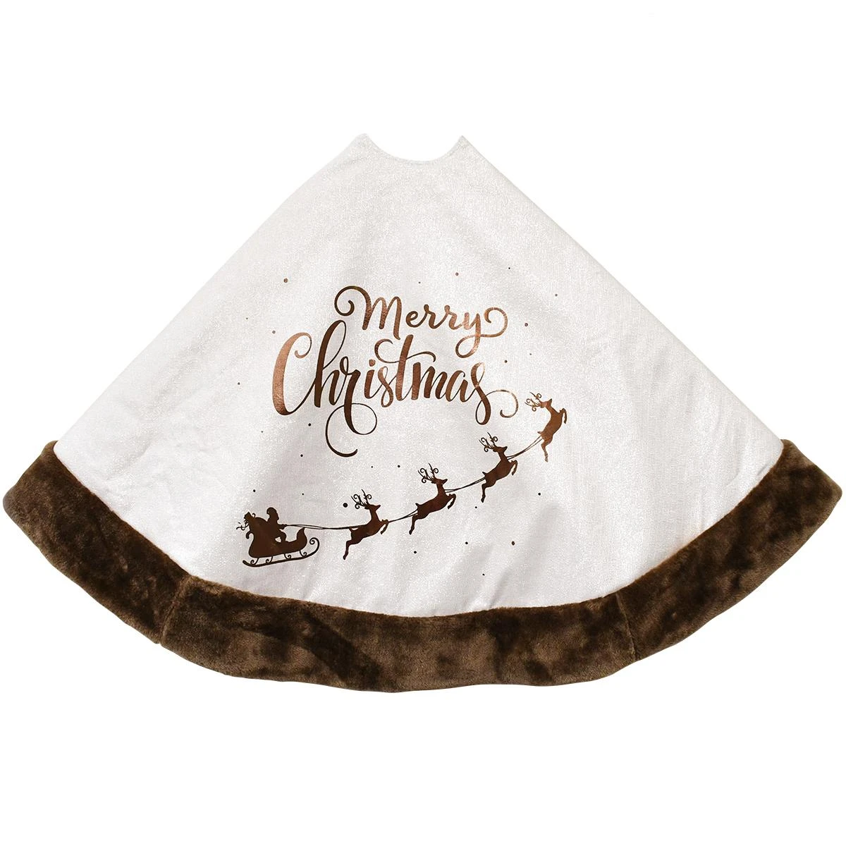 Santa’s sleigh and four prancing reindeer adorn this striking 48″ white tree skirt along with a joyous “Merry Christmas” greeting in shimmering bronze. Crafted of glittering fabric and edged in brown faux fur, this captivating skirt is completely lined in white satin and features hidden Velcro strips to hold it securely in place.