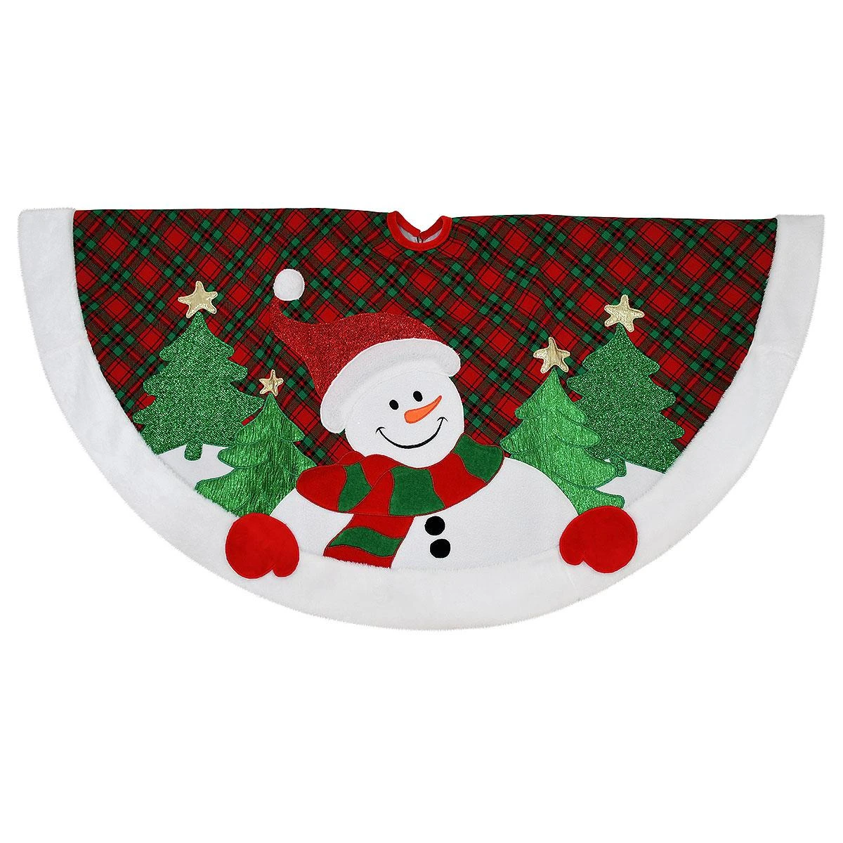 Though the weather outside may be frightful, this tree skirt is “snow” delightful! Festive in red and green plaid, our 48″ tree skirt depicts a smiling snowman with Christmas trees all around. Encircled with white faux fur, tree skirt sports a variety of eye-catching fabrics and shimmering stitching and is lined with white sateen. Hidden Velcro strips will keep it neatly in place around your Christmas tree.