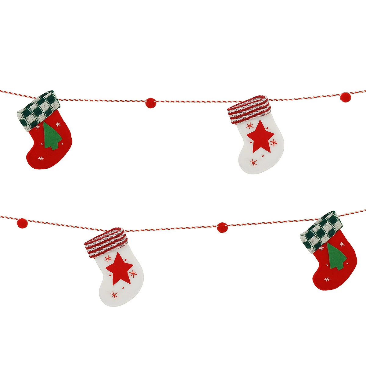 Hang this cheery string of stockings by the chimney with care to add a festive flair. Strung on a cheery red and white string with red pom-pom accents, 78″ stocking garland features six white, red, and green felt and yarn stockings with star and tree designs. 4½” stockings can be filled with candy canes or other small surprises for added holiday fun.
