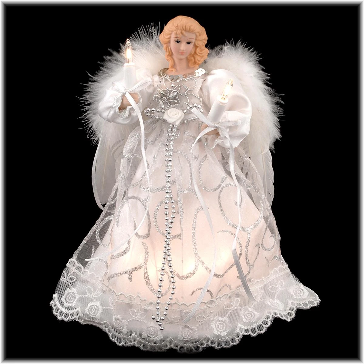 Looking for a special tree topper for a smaller tree? This gorgeous 9″ white and silver angel is elegantly dressed in flowing white gown adorned with delicate lace and shimmering silver accents. Our stunning angel features magnificent feathered wings and an exquisitely detailed face framed with honey colored locks. Glowing with 10 clear mini lights, this exquisite tree topper is sure to shine bright for many Christmases to come!