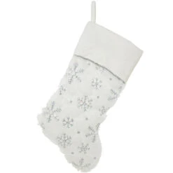 Personalized 20.5 Inch White Fur Stocking With Silver Snowflakes And Velvet Cuff