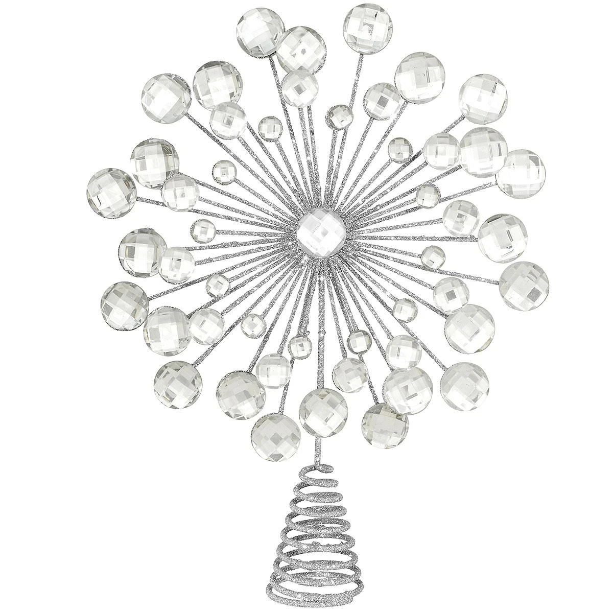 Hello sparkle! Adorned with dazzling silver glitter and an array of clear acrylic jewels, our snowflake tree topper will add a touch of elegance to your tree. Crafted of wire, topper features a traditional coil base and measures 12″ tall.