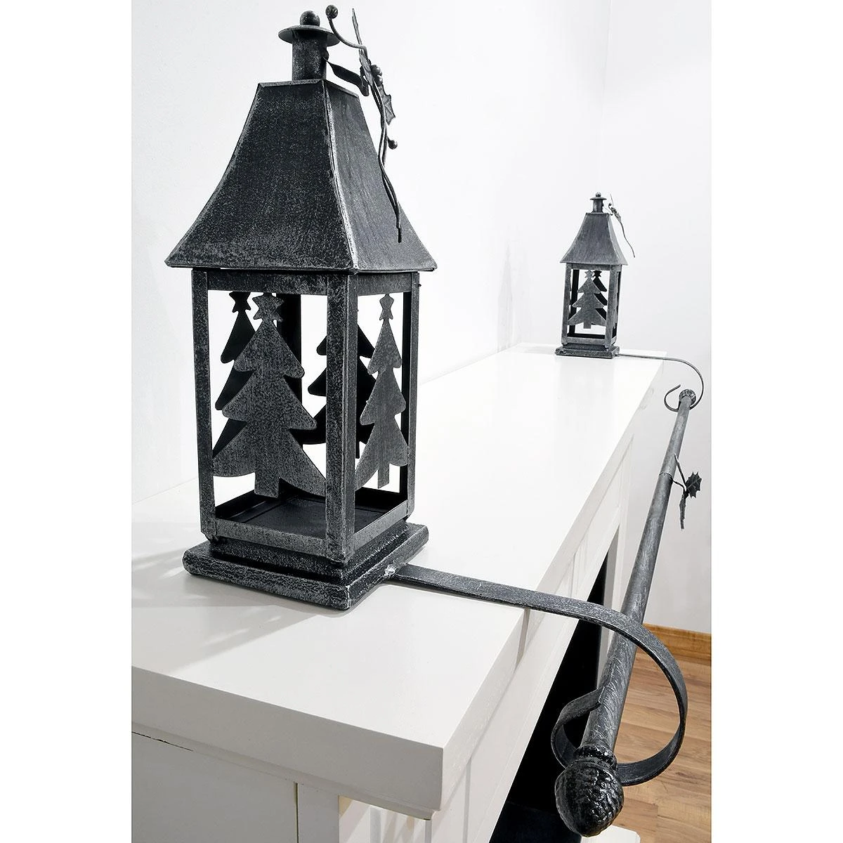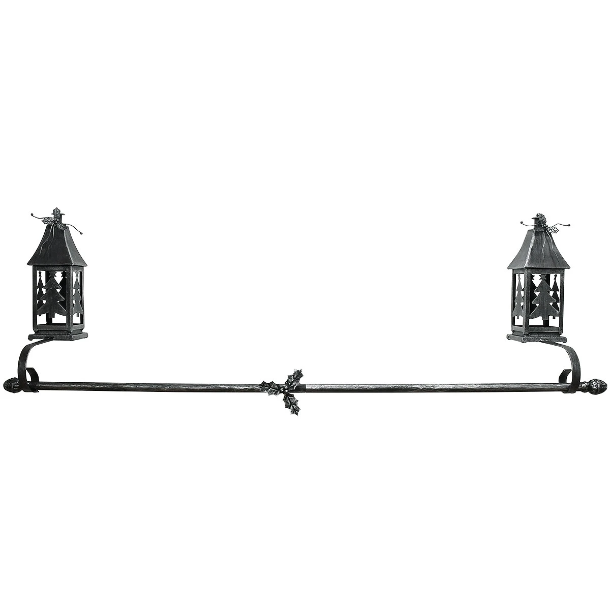 Designed for display on a mantel, this heavy duty metal stocking holder features 2 faux lanterns (measuring 11″ tall) with charming cut out tree designs and a 44½” long bar that suspends between them to display multiple stockings. Shimmering with an attractive black and silver finish and a festive holly leaf motif, this beautiful stocking holder is a convenient way to show off all of your favorite Christmas socks!