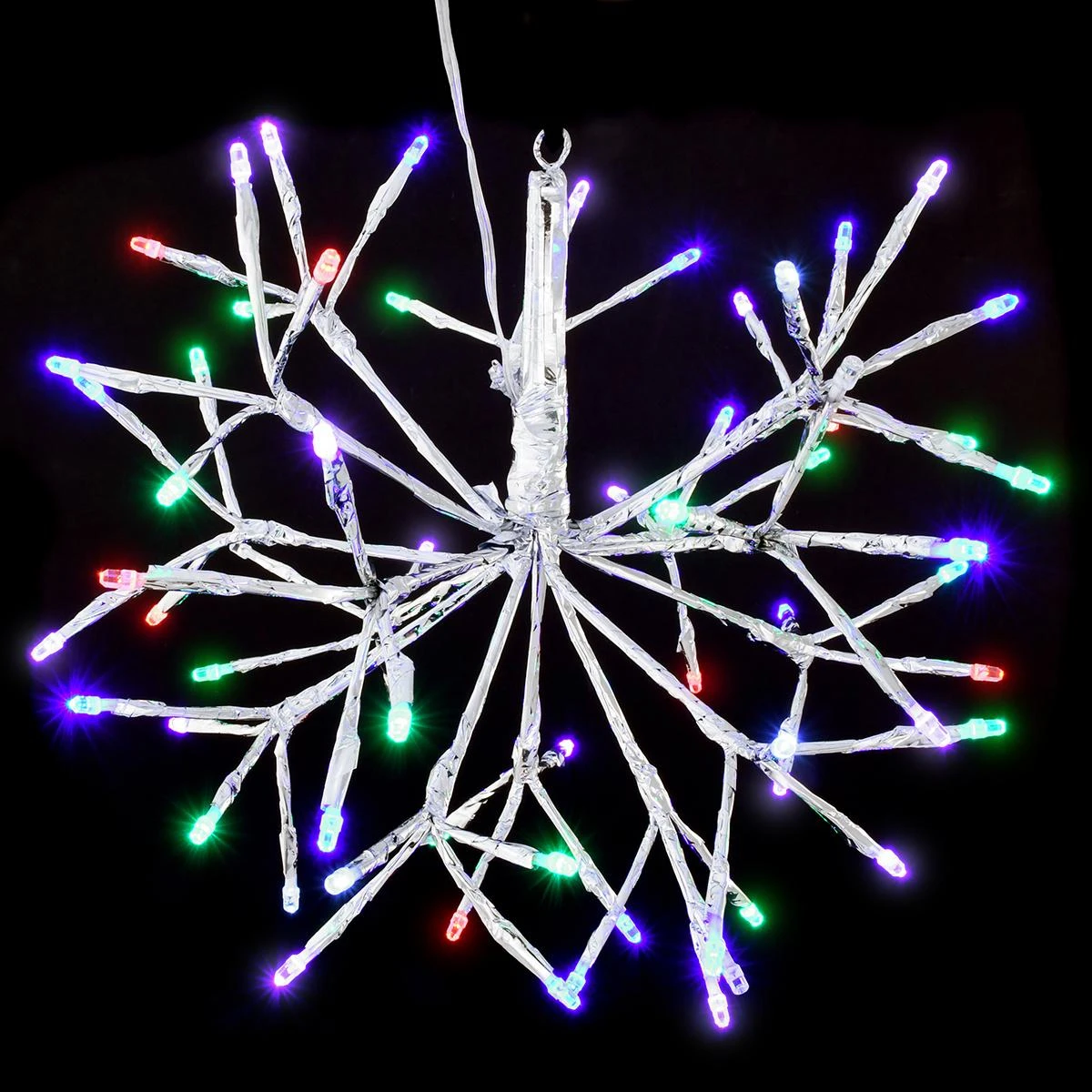 This brilliant multi-color sphere is ideal for illuminating trees, porches, balconies, ceilings and more! Crafted of metallic silver wrapped flexible wire, this weather-resistant, 12″ sphere is lit with 64 brilliant LEDs in a mix of shimmering and twinkling multi-color lights. Indoor/outdoor display is wired on a clear cord with 10 ft. plug in lead wire. Some shaping required. 12v, UL listed.