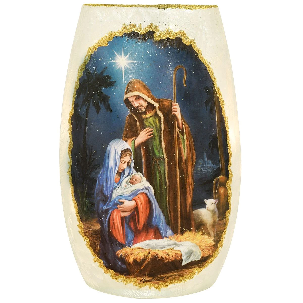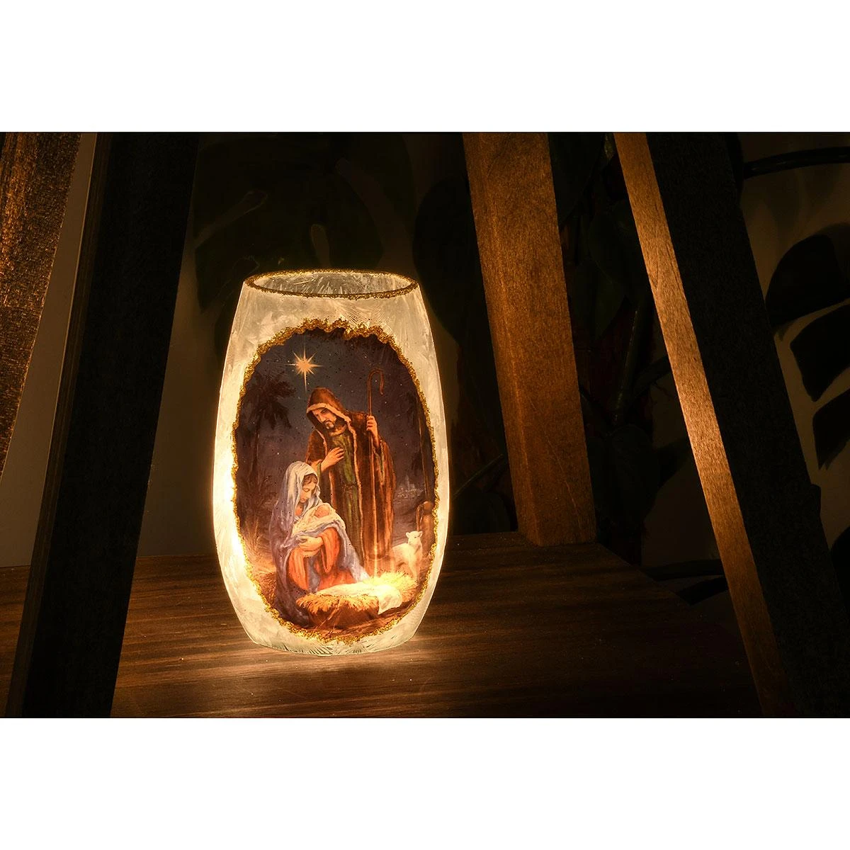 Brighten your Advent and Christmas season with this beautiful pre lit vase with nativity scene. Featuring a colorful image of the holy family, this 5″ tall glass, ice crackle vase is embellished with gold glitter accents and is illuminated by 11 warm white UL listed miniature lights.