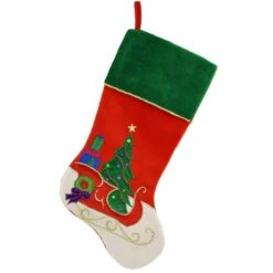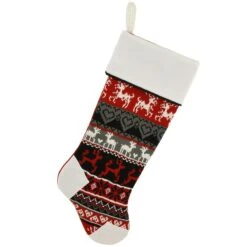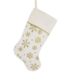 This 20½” stocking “knits” together a cozy flurry of snowflakes, that are cute as a button, in a classically Christmas design. Completely lined in red polyester with a felt backing, this stamped cotton stocking features a soft white plush cuff.