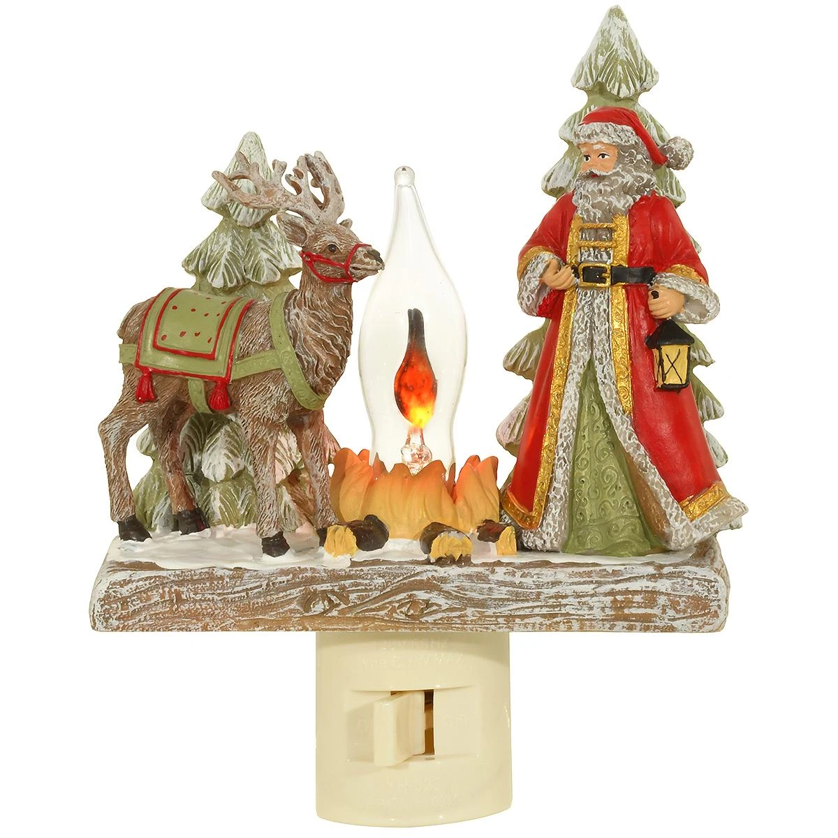 Add a magical touch to your home with this delightful Christmas scene! Night light features a vintage looking Santa and reindeer gathered around a glowing campfire with realistic flicker flame bulb. Crafted of resin and plastic with colorful painted accents, 5ΒΌ” nightlight includes bulb with flicker flame, and a 360 degree swivel plug-in base with convenient on/off switch.UL listed.