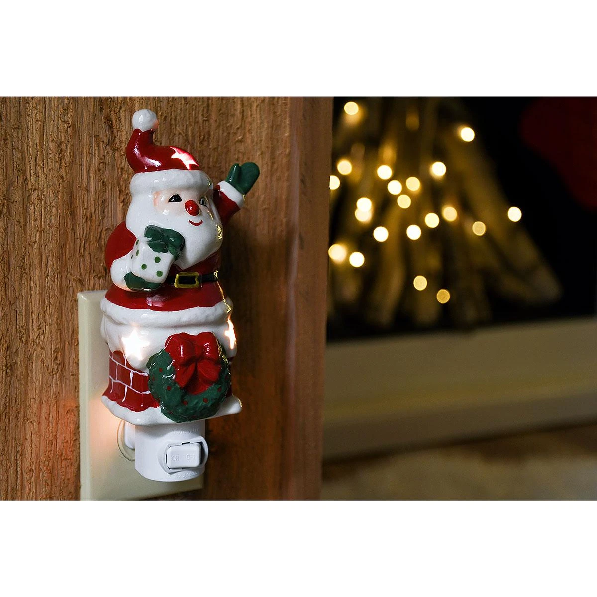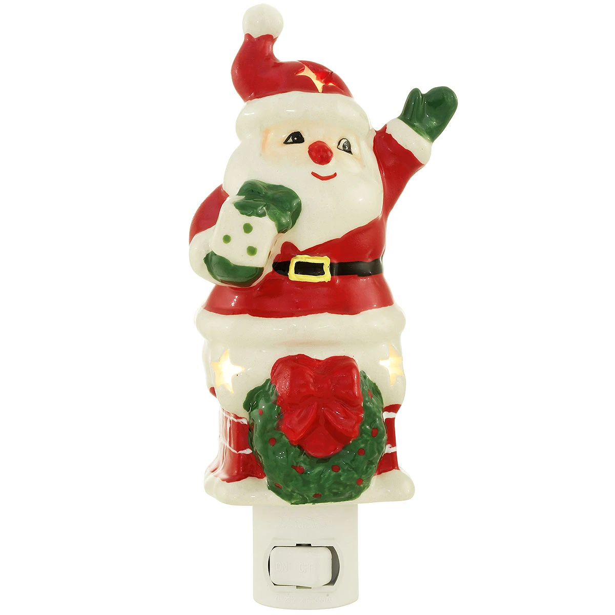 Up on the housetop, reindeer pause – out jumps good ole’ Santa Claus … Waving from a festively decorated brick chimney with gift in hand, Santa is sure to keep your Christmas evenings so merry & BRIGHT! Crafted from ceramic, this UL Certified® Christmas night light measures approximately 7¼” tall from top to base. Nightlight features a 360 degree swivel plug-in base with convenient on/off switch.