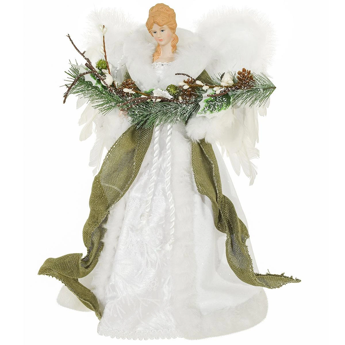 Top your tree with divine inspiration! Our white angel tree topper is adorned with an eye-catching garland of greenery while her snowy white dress is trimmed with fur and a cascading ribbon of sage green. Framing her beautiful hand-painted face are magnificent wings crafted with natural feathers. Tree top measures approximately 17ΒΌ” tall.Β